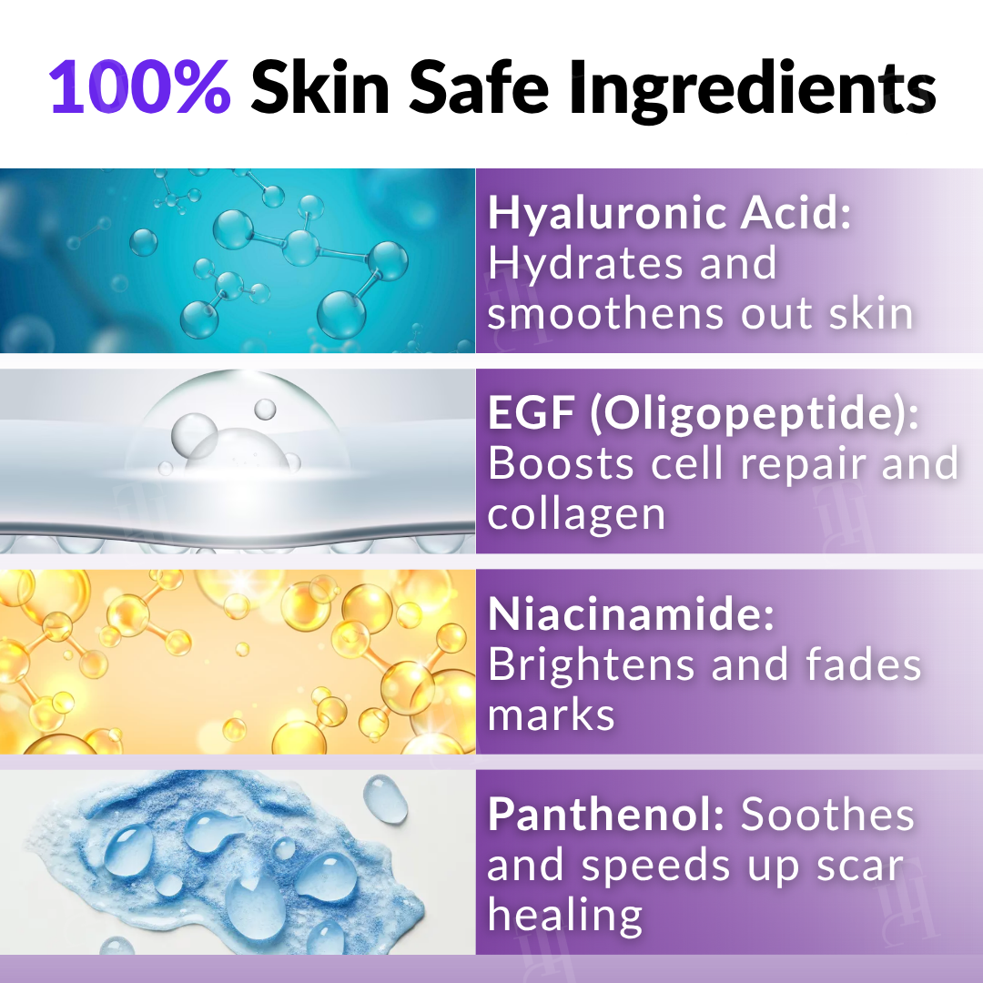 Deep Ingredient Delivery: EGF, Niacinamide, Hyaluronic Acid, and Panthenol penetrate deep to repair collagen and boost renewal—beyond what creams can do.